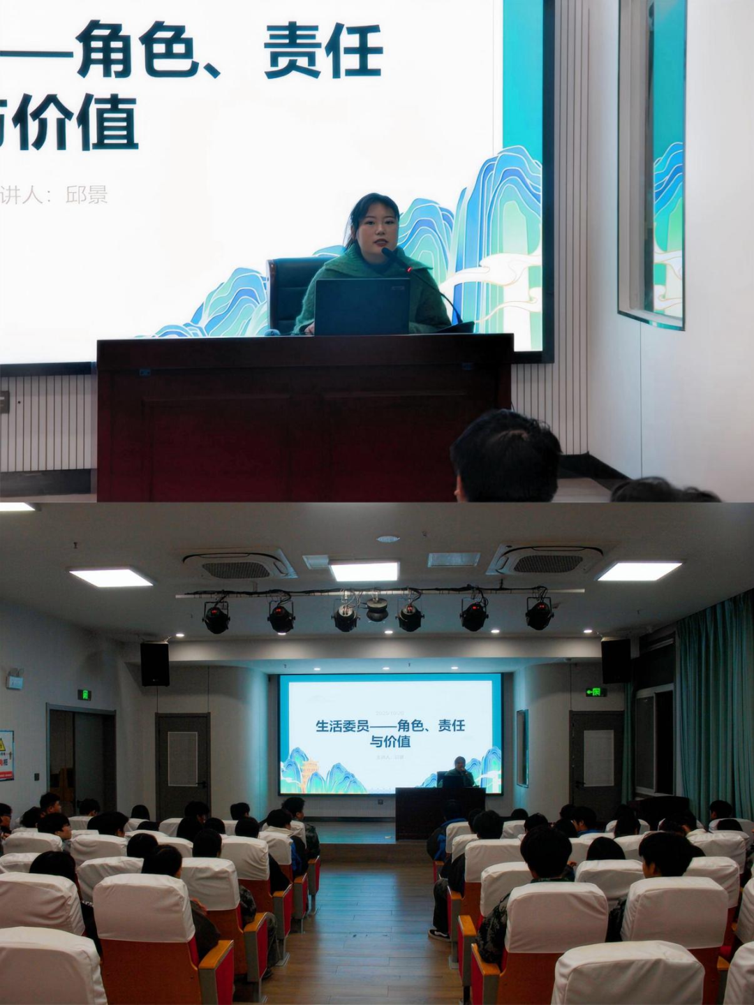 邱景主任从生活委员的角色定位入手,系统阐述了其在班级中承担的三重身份:班级组织者、师生沟通桥梁以及校园环境的积极维护者。他强调,生活委员不仅是服务的践行者、责任的承担者,更应在履职过程中实现个人能力的全面提升。