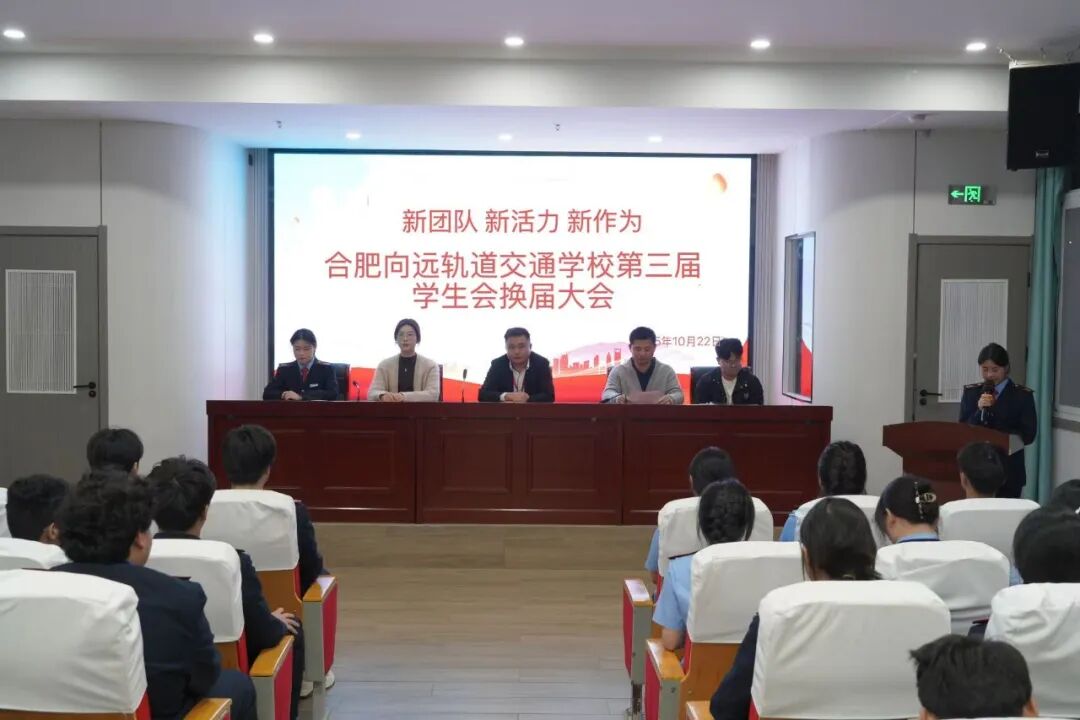 2025年10月22日,合肥向远轨道交通学校第三届学生会换届大会在向善楼一楼报告厅隆重召开。副校长李星、团委书记李卿、学生会指导老师王真真、社团指导老师王伦出席,学生会全体成员共同参加。