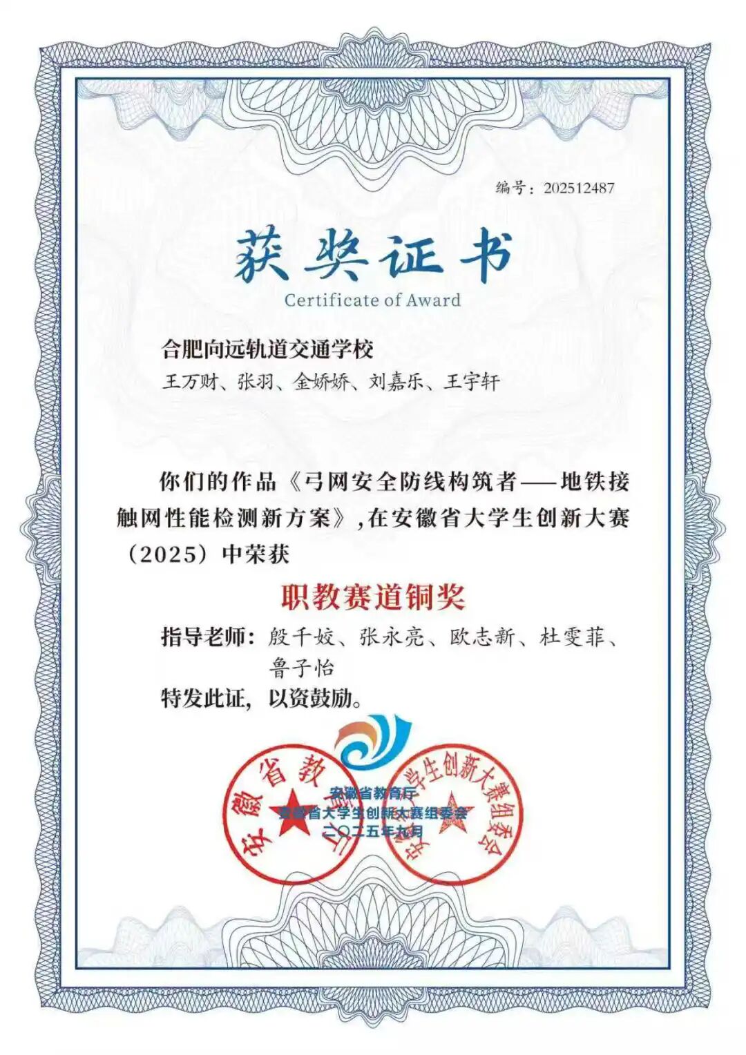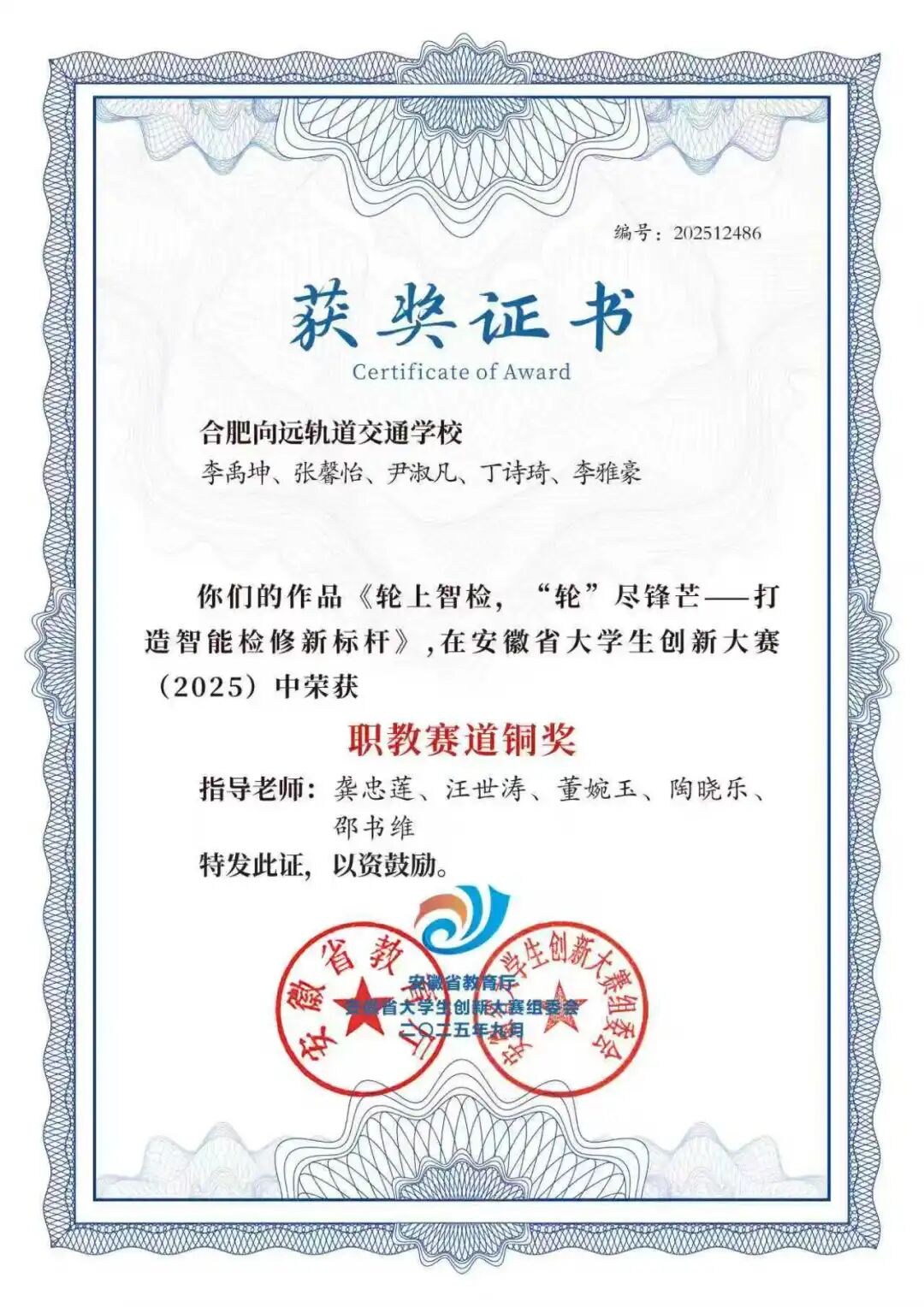 近日,2025年安徽省大学生创新大赛获奖名单正式公布。合肥向远轨道交通学校两支学生团队凭借出色的创新作品,在职教赛道中双双荣获铜奖,充分展现了学校在创新教育与实践育人方面的扎实成效。