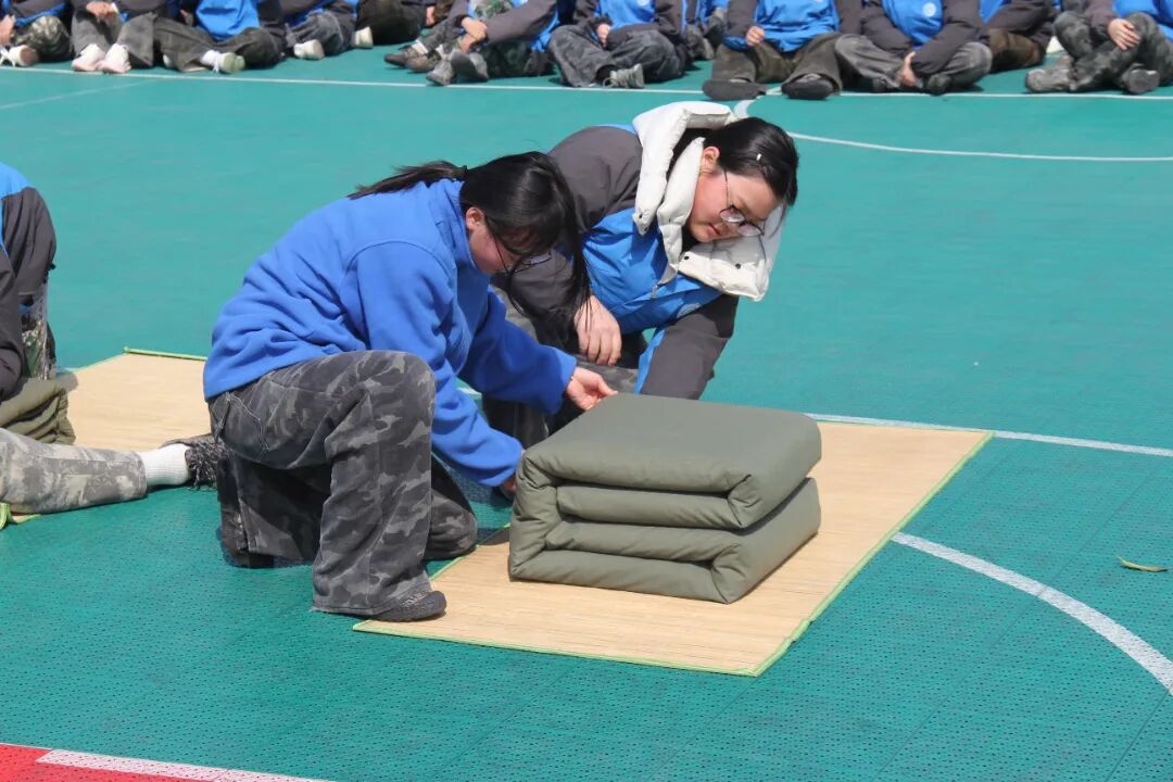 总结大会上,参训学生以饱满的精神状态接受检阅。队列展示中,步伐铿锵有力、口号响彻云霄;叠军被展示环节,方寸之间见真章——一床床棱角分明的“豆腐块”,赢得阵阵掌声。跑操展示更是将现场气氛推向高潮,整齐的方阵、昂扬的斗志,尽显轨道交通学子行业标准化管理的职业潜质。
