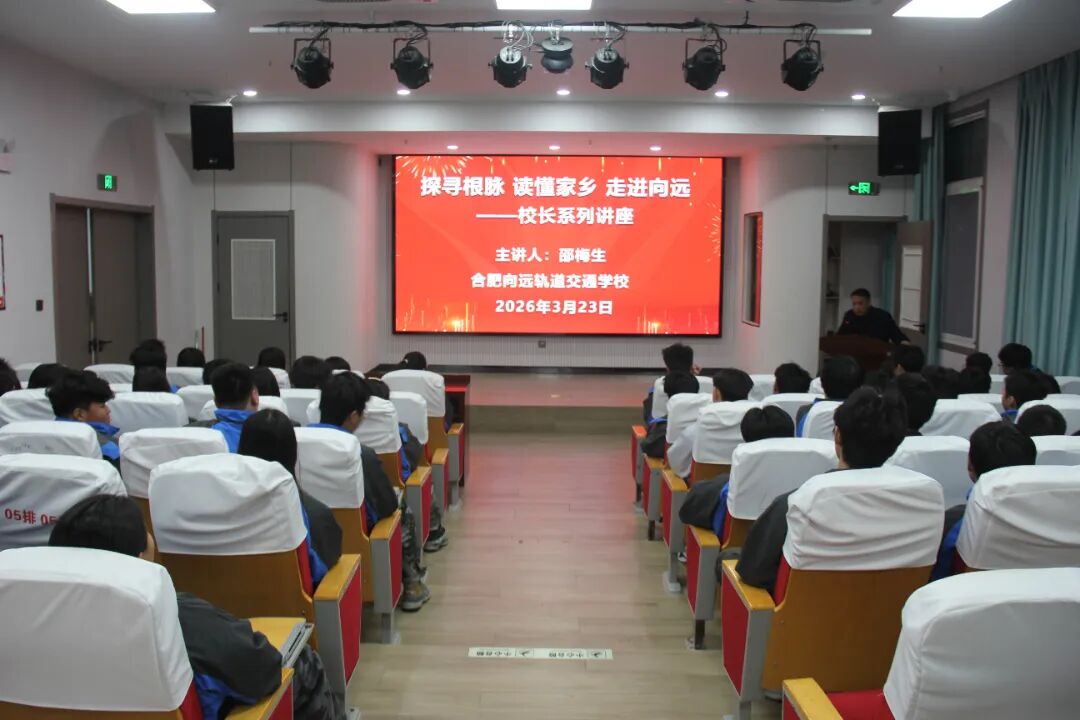 为进一步增强新生对中华文明的认同感、对长丰发展的自豪感、对学校文化的融入感,2026年3月23日晚,合肥向远轨道交通学校在报告厅举办“国史校史一训三风”专题教育讲座。讲座由学校常务副校长邵梅生主讲,学生代表到场聆听。